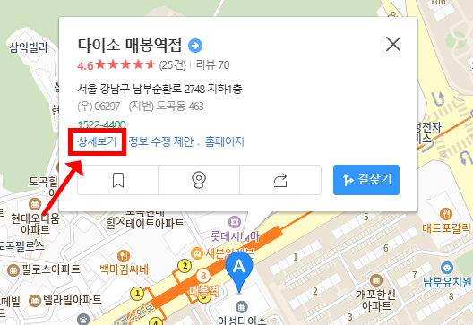 이것도 상당히 편리한 방법입니다. 영업시간만 확인하고 방문할 예정이라면 다이소앱을 이용할 필요없이 평소 자주 사용하는 네이버 지도나 다음 지도에서 '다이소'와 매장명을 검색하면 영업시간을 빠르게 확인할 수 있습니다. 다이소 매봉역점을 다음지도에서 찾으면 왼쪽사진과 같이 표시되는데 여기서 상세보기를 선택해 들어가시면(오른쪽 사진) 영업시간, 찾아가는 방법까지 자세히 보여줍니다.